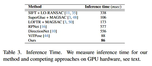 우리는 카메라 pose 추정에 대한 전통적인 접근과 학습된 접근과 비교한다. 학습된 컴포넌트는 2가지 방법으로 통합된다. 첫째, hand-crafted와 학습된 feature를 -RANSAC과 MAGSAC과 같은 견고한 추정기와 결합한 keypoint 기반 접근을 사용한다. 둘째, 우리의 방법을 En et al(RPNet), Chen et al(DirectionNet)과 Rockwell et al(우리는 이 접근을 ViTPose라 한다)와 같은 기존 최첨단 end-to-end pose 추정 모델과 비교한다. 모든 방법이 기존 pose 추정 데이터셋(예: MatterPort3D)에서 잘 작동하지만 wide baseline 데이터에 평가할 때는 어려움을 겪는 것을 발견했다.