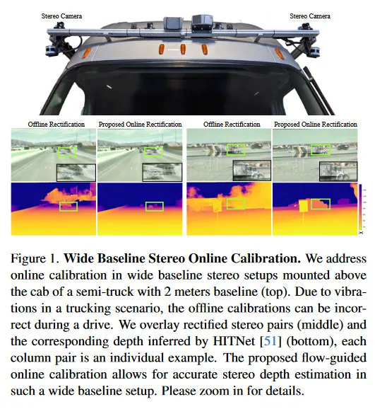 wide baseline stereo 방법은 수 미터 떨어진 카메라를 사용하는 방법으로 100미터 이상의 장거리 깊이 측정을 가능케 하는 low-cost depth 센싱 방법으로 제안되었다. 자율주행 트럭, 대형 건설이나 농장 로봇이나 UAVs 등에서 활용되는 경우, 장착된 카메라는 큰 진동을 경험하고 offline calibration에서 크게 벗어난다. 따라서 online stereo calibration은 이러한 센서 시스템의 기능을 자율 의사결정 스택의 일부로 유지하는데 필수적이다. 특히 대형 장거리 차량의 경우, 온도와 스트레스 gradient 때문에 baseline 장착 구조물이 stretch되고 twist 될 수 있다. 제안 방법(그림 1 참조)에서 다루는 calibration 품질은 stereo depth 추정, 3D object detection, semantic segmentation과 SLAM 등 차량 주변 환경을 이해하는 목적의 downstream 작업에 필수적이다.