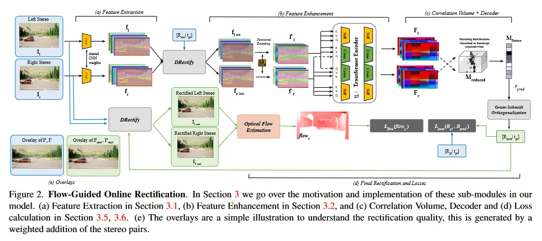 이 섹션에서 online rectification 모델과 flow-guided 학습 접근을 소개한다. Local feature 기반 pose 추정 방법은 고속도로 트럭 주행 시나리오에서 rolling-shutter 효과와 기계적 진동이 결합되어 빈곤하게 수행될 수 있다. 이 도전을 해결하기 위해 우리는 cross attentional 이미지 feature와 stereo cost volume을 활용하여 stereo 쌍에서 pose를 직접 예측하고 pose에 대해 최적화 한다. 게다가 real 데이터에 대해 우리는 강한 진동 때문에 고속도로 운전 시나리오에서 유지되지 않는 정적 offline calibration만 수행할 수 있다. 이를 위해 self-supervised vertical flow 손실에 의존하고 offline calibration을 semi-supervised rotation loss로 사용한다. 빈곤한 회전은 downstream task에 큰 영향을 미칠 수 있고, stereo baseline은 고정되므로 우리의 모델은 stereo 쌍에서 상대적 회전을 추정하도록 학습한다.