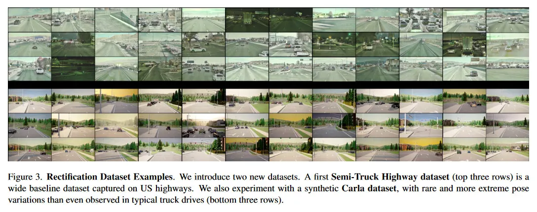 알려진 ground truth pose 정보와 real capture에서는 희귀한 극단적인 pose 편차를 시뮬레이션 하는 능력을 가진 Carla 주행 시뮬레이터를 활용하여 추가로 합성 데이터셋을 생성한다. 여기서 sensor 설정은 regular 교통 차량에 장착된 각 0.8m의 baseline으로 분리된 3개 RGB 카메라로 구성된다. 각 카메라는 2560x1440 해상도의 이미지를 30hz로 캡쳐한다.