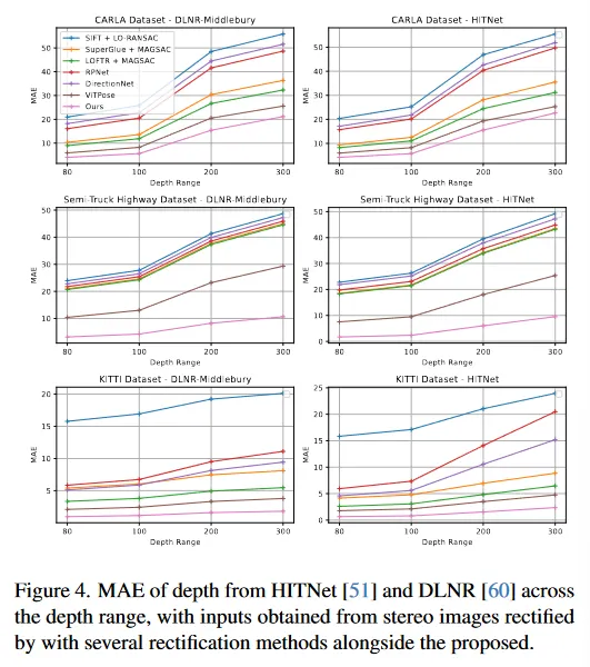 우리는 개선된 rectification이 downstream 작업 성능에 미치는 영향을 평가하고 다른 접근 법을 사용하여 두 가지 SOTA stereo 모델(HITNet과 DLNR)에 전달한다. 그림 4는 다양한 거리에 대한 MAE의 정량적 비교를 보여주며(이 MAE 메트릭은 Ground Truth Depth에 대해 계산되므로 표 2와 다름), 그림 5는 rectification과 결과 stereo depth의 정성적 비교를 보여준다. 우리는 먼 거리에서 depth 추정이 전반적으로 나쁘다는 경향을 관찰했는데, 이는 rectification 보다 모델 자체의 문제로 인한 것이다. 이를 염두해 두고 제안된 방법을 사용할 때 Carla 데이터셋에서 DLNR로 [0-300]m 범위에서 평균 17%, HITNet으로 평균 10%의 MAE 개선을 측정했다. KITTI에서는 MAE가 다른 방법과 유사하지만 두 SOTA 모델 모두에서 [0-300]m 범위에서 51% 개선되었다. 마지막으로 세미트럭 고속도로 데이터셋에서 두 모델 모두 [0-300]m 범위에서 평균 63% 이상의 큰 MAE 성능 향상을 측정했다. 이를 통해 제안된 모델의 rectification 성능이 더 낫고 더 높은 정확도의 깊이 추정을 가능하게 함을 확인할 수 있다.