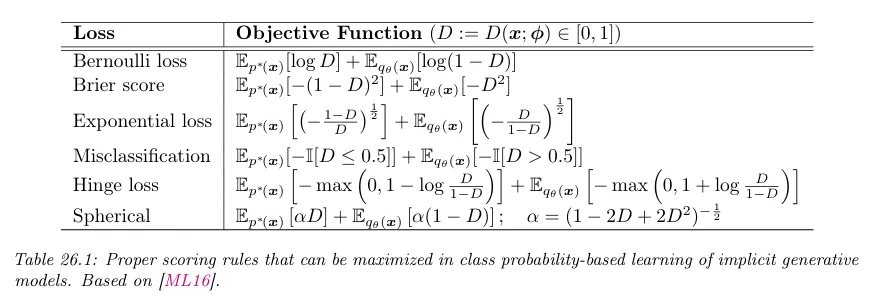 위에 사용된 베르누이 scoring 규칙 외에도 min-max 최적화를 통해 생성 모델을 학습하는데 다른 scoring 규칙이 사용되었다. 판별기 최적성 조건에서 위에 표시된 것과 유사한 인수를 통해 Pearson 발산을 최소화하는 것에 해당하는 것으로 볼 수 있는 Brier scoring 규칙은 LS-GAN으로 이어졌다. hinge scoring 규칙이 대중화되었으며, 판별기 최적성 조건에서 total variational 거리를 최소화하는 것에 해당한다.