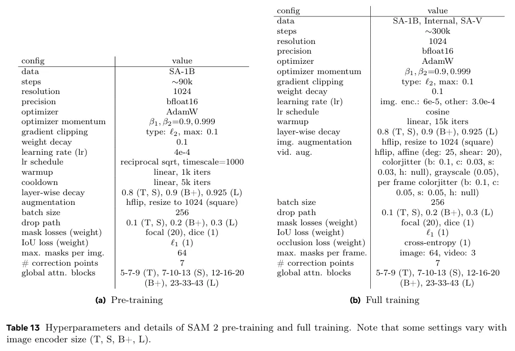 SAM 2는 2가지 작업을 위해 설계되었다. PVS 작업(비디오에서)와 SA 작업(이미지에서). 학습은 이미지와 비디오 데이터를 결합하여 진행된다. 학습하는 동안 데이터 사용량과 계산 자원을 최적화하기 위해, 우리는 비디오 데이터(여러 프레임)과 정적 이미지(단일 프레임) 사이의 교대 학습 전략을 채택한다. 구체적으로 각 학습 반복에서 우리는 이미지 또는 비디오 데이터셋에서 full batch를 샘플링하며, 샘플링 확률은 각 데이터 소스의 크기에 비례한다. 이 접근 방식은 두 작업에 대해 균형 잡힌 노출을 가능하게 하며, 각 데이터 소스에 대해 다양한 배치 크기를 사용하여 계산 활용을 최대화한다. 이미지 작업에 대해 여기서 명시적으로 언급되지 않은 설정은 pre-training 단계의 설정을 따른다. full training 단계에서 hyper-parameter는 표 13(b) 참조. 학습 데이터는 약 15.2%의 SA-1B, 약 70%의 SA-V, 약 14.8% Internal의 혼합으로 구성된다. 오픈소스 데이터셋이 포함될 때도 동일한 설정이 사용되며, 추가 데이터가 포함된다(약 1.3% DAVIS, 약 9.4% MOSE, 약 9.2% YouTubeVOS, 약 15.5% SA-1B, 약 49.5% SA-V, 약 15.1% Internal)