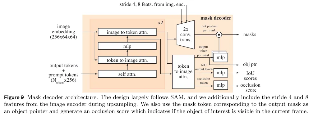 Prompt encoder and mask decoder. prompt 인코더 디자인은 SAM을 따르고 다음으로 mask 디코더에서 설계 변경에 대한 추가 세부 사항을 논의한다. 우리는 출력 마스크에 해당하는 mask 토큰을 해당 프레임의 object pointer token으로 사용하며 이것은 memory bank에 저장된다. 섹션 4에서 논의한 것처럼 우리는 occlusion 예측 헤드를 도입한다. 이것은 마스크와 IoU 출력 토큰과 함께 추가 토큰을 포함하여 구현된다. 이 새로운 토큰에 추가 MLP 헤드를 적용하여 현재 프레임에서 관심 있는 객체가 보일 likelihood를 나타내는 점수를 생성한다.(그림 9 참조)