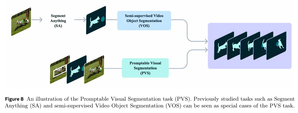 PVS는 정적 이미지와 비디오 도메인 모두에서 여러 작업과 연관된다. 이미지에서 SA 작업은 비디오를 단일 프레임으로 축소시킨 PVS의 부분 집합으로 고려될 수 있다. 유사하게 기존의 semi-supervised와 interactive VOS 작업은 PVS의 특별한 경우로, 각각 첫 번째 프레임에만 제공되는 mask 프롬프트와 비디오에 걸쳐 객체를 segment하기 위해 여러 프레임에 그려진 scribbles로 제한된다. PVS에서 프롬프트는 click, mask, box 일 수 있고 상호작용 경험을 향상 시키는데 초점을 맞추어 최소한의 상호작용으로 객체의 segmentation의 쉽게 수정할 수 있게 한다.