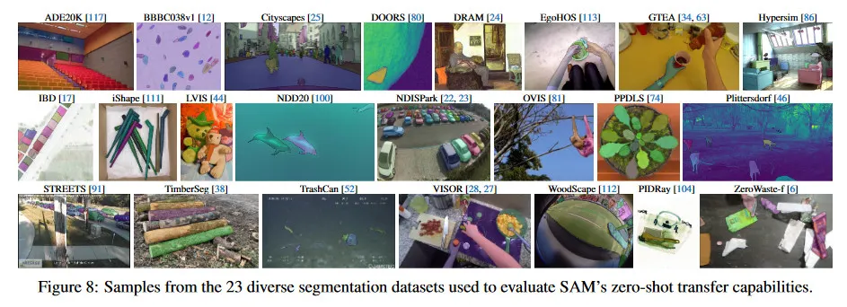 우리는 다양한 이미지 분포를 갖는 23개의 새로운 dataset suit를 사용한다. 그림 8은 dataset을 리스트업하고 각각에서 샘플을 보인다(더 상세한 것은 부록에서 Table 7 참조). 우리는 mIoU 평가에 모든 23개 데이터셋을 사용한다. 인간 연구에서는 리소스 요구 사항으로 인해 그림 9b에서 리스트된 하위 집합을 사용한다. 이러한 하위 집합에는 automatic 메트릭을 따라 SAM이 RITM을 능가하거나 열등한 성능을 데이터셋이 모두 포함된다.