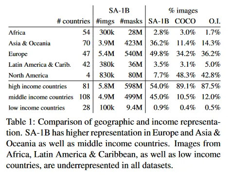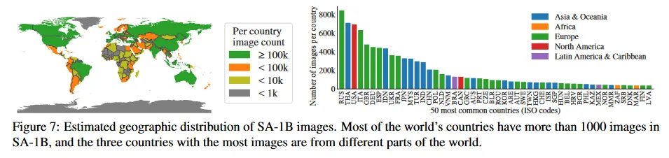 우리는 표준 방법(부록 C)를 사용하여 이미지가 촬영된 국가를 추론한다. 그림 7에서 우리는 SA-1B(left)의 국가별 이미지 수와 이미지 수가 가장 많은 50개 국가(오른쪽)을 시각화한다. 상위 3개 국가가 세계의 다른 지역임에 주목한다. 다음으로 Table 1에서 SA-1B, COCO, Open Images의 지리적과 소득 분포를 비교한다. SA-1B는 유럽과 아시아 및 오세아니아 지역과 중소득 국가의 이미지 비율이 상당히 높다. 모든 데이터셋은 아프리카와 소득이 낮은 국가들을 과소 나타낸다. SA-1B에서는 아프리카를 포함하여 모든 region에서 최소 28 M 마스크를 가지며, 이는 기존 데이터셋보다 최소 10배 더 많은 mask의 수이다. 마지막으로 region과 income에 따라 이미지당 mask 평균수가(표시되지 않음) 비교적 일정하게 나타난다(이미지당 94-108).