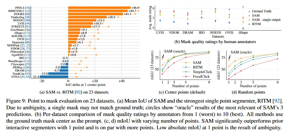 그림 9c는 추가적인 baseline인 SimpleClick과 FocalClick을 보인다. 이것들은 RITM과 SAM 보다 single point 성능이 낮다. point의 수가 1에서 9로 증가함에 따라 방법들 간의 격차가 감소함을 관찰할 수 있다. 이것은 task가 쉬워짐에 따라 예상된 것이며, SAM은 매우 높은 IoU 체제에 최적화 되어 있지 않았다. 마지막으로 그림 9d에서 default center point 샘플링을 random point sampling으로 교체한 것을 보인다. 우리는 SAM과 baseline 사이의 격차가 커지는 것을 관찰하고, SAM이 어떤 sampling 방법 하에서도 비교 가능한 결과를 달성할 수 있음을 관찰한다.