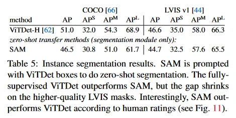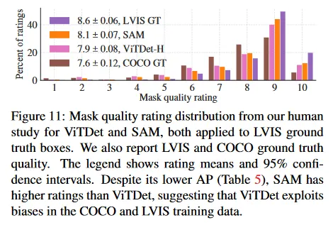 COCO에서 mask AP 격차는 더 크고 ground truth 품질은 상대적으로 낮다(인간 연구에 의해 확인됨)는 것을 근거로, ViTDet가 COCO mask의 특정한 bias를 학습했다고 가정한다. SAM은 zero-shot 방법이므로 이러한 (일반적으로 바람직하지 않은) bias를 활용할 수 없다. LVIS 데이터셋은 더 높은 품질의 ground truth를 갖지만 특정한 idiosyncrasies(특이성)이 존재하고(예: mask가 구멍을 포함하지 않고 단순한 다각형으로 구성됨) model vs amodal mask에 대한 bias가 존재한다. 다시말해 SAM은 이러한 bias를 학습하지 않지만 ViTDet은 그것들을 활용한다.