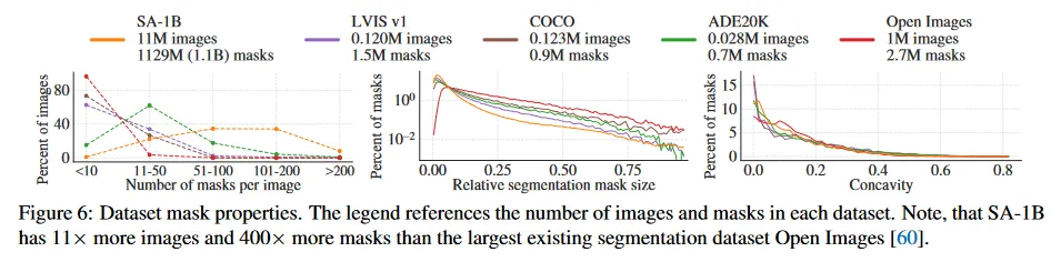 그림 5에서 SA-1B의 object 중심의 공간적 분포를 가장 큰 기존 segmentation 데이터셋과 비교하여 그린다. 모든 데이터셋에서 공통적으로 사진가 편향이 존재한다. SA-1B는 LVIS v1과 ADE20K와 비교하여 유사한 데이터셋보다 이미지 코너 커버리지가 더 넓은 반면 COCO와 Open Image V5는 더 두드러지는 center bias를 갖는다. 그림 6(legend)에서 이러한 데이터셋을 크기별로 비교한다. SA-1B는 두 번째 큰 데이터셋인 Open Image 보다 이미지가 11배 더 많고 mask가 400배 더 많고 평균적으로 Open Image 보다 이미지당 36배 더 많은 mask를 갖는다. 이 측면에서 가장 가까운 데이터셋은 ADE20K이고 여전히 이미지당 마스크가 3.5배 적다. 그림 6 중간에서 이미지에 대한 mask의 상대적 크기(mask area의 제곱근을 이미지 area로 나눈 값)를 보인다. 예상대로 우리의 데이터셋이 이미지당 더 많은 mask를 가지므로, 상대적으로 small과 medium mask가 더 많이 포함된다. 마지막으로 형태의 복잡성을 분석하기 위해, mask 오목성(mask의 볼록의 area에 의해 나눠짐 1-mask area)을 본다. 그림 6 오른쪽. mask 크기와 shape 복잡성이 상관있기 때문에, 우리는 우선 mask 크기별로 계층화된 샘플링을 수행하여 각 데이터셋의 마스크 크기 분포를 조정한다. 우리는 mask의 오목성 분포가 다른 데이터셋과 대체로 유사함을 발견한다.