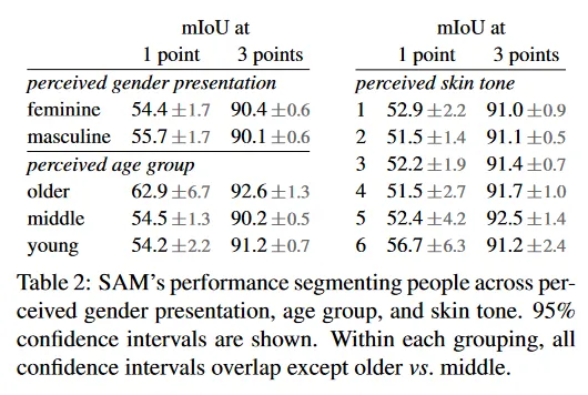 우리는 SAM의 구별 성능을 측정하기 위해 인식된 성별 표현, 연령대, 피부톤에 따른 잠재적 공정성 문제를 조사한다. gender presentation과 age에 대해서는 More Inclusive Annotations for People(MIAP)를 사용하고, skin tone에 대해서는 독점 데이터셋(부록 C)을 사용했다. 우리의 평가는 1개 및 3개 포인트를 랜덤 샘플링하여 시뮬레이션된 interactive segmentation을 사용 한다(부록 D). Table 2(top left)는 인식된 성별 표현에 대한 결과를 보인다. 여성이 detection과 segmentation 데이터셋에서 과소 대표된 것으로 알려져 있지만, SAM은 그룹 간에 유사한 성능을 보인다. Table 2(bottom left)에서는 인식된 나이에 대한 분석을 반복했으며, 어린 사람과 나이든 사람들이 대규모 데이터셋에서 과소 대표된 것으로 나타났다. SAM은 나이가 많은 것으로 인식된 사람들에서 가장 좋은 성능을 보였지만 confidence interval이 크다. 마지막으로 Table 2 (right)에서 인식된 피부 톤에 대한 분석을 반복했으며, 더 밝은 피부색이 더 많이 대표되고 어두운 피부색이 대규모 데이터셋에서 덜 대표되는 것으로 알려져 있다. MIAP은 인식된 피부색 주석을 포함하지 않기 때문에 우리는 Fitzpatrick 피부 유형에 대한 주석이 포함된 proprietary dataset을 사용했으며, 이는 1(가장 밝은)에서 6(가장 어두운) 범위를 갖는다. 평균 값이 다소 차이가 있지만 그룹 사이에 큰 차이가 없음을 발견했다. 우리는 이러한 결과가 작업 특성에서 비롯된 것으로 보고 있으며, SAM이 더 큰 시스템의 component로 사용될 때 드러날 수 있음을 인지한다. 마지막으로 부록 C에서 우리는 옷 segmenting으로 확장한다. 여기서 인식된 성별 표현에 대한 편향이 나타남을 발견한다.
