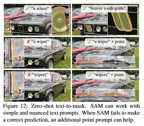 우리는 그림 12에서 정성적 결과를 보인다. SAM은 ‘a wheel’ 같은 간단한 텍스트 프롬프트 뿐만 아니라 ‘beaver tooth grille’ 같은 phase로도 object를 segment할 수 있다. SAM이 텍스트 프롬프트만으로 올바른 object를 고르는 것을 실패할 때, [31]과 유사하게 추가 포인트를 제공하면 종종 예측이 수정된다.