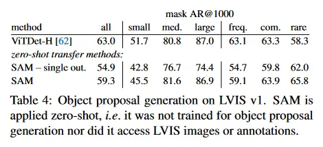 Table 4에서 보이듯, ViTDet-H의 detection을 object proposal로 사용하는 것(AR을 개선하는 DMP 방법)이 전체적으로 가장 높은 성능을 수행한다. 그러나 SAM은 여러 메트릭에서 주목할만하다. 특히 SAM은 medium, large, 희귀하고 일반적인 object에서 ViTDet-H를 능가한다. 실제로 SAM은 small과 빈번한 object에 대해서만 ViTDet-H를 밑돌았다. 이것은 ViTDet-H가 SAM과 달리 LVIS에서 학습되었기 때문에 LVIS 특유의 annotation 편향을 쉽게 학습할 수 있기 때문이다. 우리는 또한 ablated인 모호성 미인식 버전의 SAM(single out)과도 비교한다. 이것은 모든 AR 메트릭에서 SAM 보다 매우 나쁘게 수행된다.