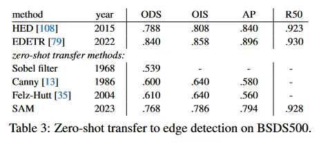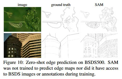 우리는 그림 10에서 대표적인 edge map을 시각화한다(더 자세한 것은 그림 15 참조). 정성적으로 우리는 SAM이 edge detection에 대해 학습되지 않았음에도 합리적인 edge map을 생성함을 관찰한다. ground truth와 비교할 때, SAM은 BSDS500에서 주석처리되지 않은 합리적인 것을 포함하여 더 많은 edge를 예측한다. 이러한 bias는 Table 3에서 정량적으로 반영되며 50% 정밀도에서의 recall(R50)은 높은 대신 정밀도가 떨어진다. SAM은 자연히 BSDS500의 bias(즉 어떤 edge를 억제해야 하는지)를 학습한 최첨단 모델에 뒤쳐지지만, HED와 같은 선구자 딥러닝 방법과 비교해도 잘 수행되고, 이전의(구식이지만) zero-shot transfer 방법 보다 훨씬 나은 성능을 보인다.