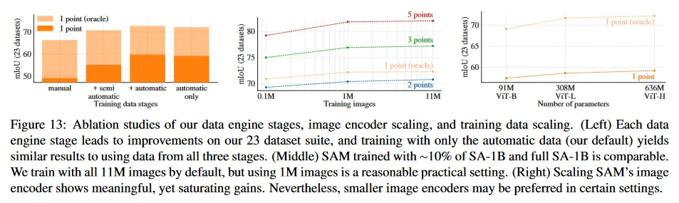 그림 13(왼쪽)은 data engine 단계에서 누적된 데이터에 학습될 때 SAM의 성능을 보인다. 각 단계가 mIoU를 증가시키는 것을 볼 수 있다. 3 단계를 모두 사용하여 학습할 때, automatic mask가 수작업, semi-automatic mask보다 훨씬 많다. 이것을 해결하기 위해 우리는 학습하는 동안 수작업과 semi-automatic을 10배 oversampling하는 것이 최고 결과를 제공한다는 것을 발견했다. 이 설정은 학습을 복잡하게 한다. 따라서 우리는 자동적으로 생성된 마스크만 사용하는 4번째 설정을 테스트한다. 이 데이터를 사용한 SAM은 모든 데이터를 사용할 때보다 약갖 낮은 성능(약 0.5 mIoU)을 보였다. 따라서 기본적으로 우리는 학습 설정을 간단하게 하기 위해 자동적으로 생성된 mask만 사용한다.