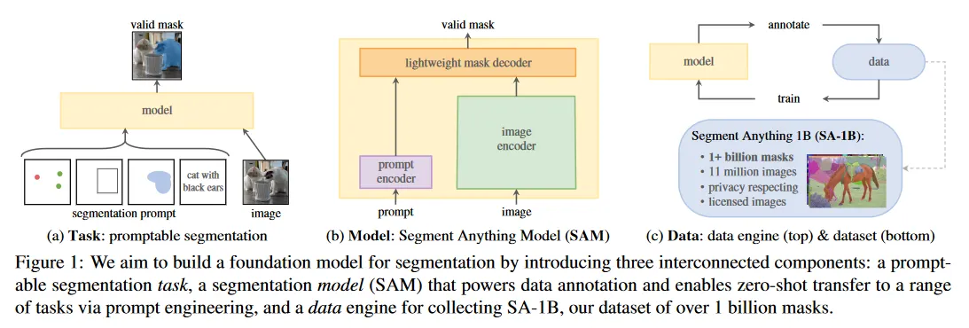 3가지 질문은 얽혀있으며, 포괄적인 해결책을 필요로 한다. 우리는 강력한 pre-training 목적을 제공하고 광범위한 downstream 응용을 가능하게 할만큼 promptable segmentation task를 정의하는 것에서 시작한다. 이 task는 유연한 prompting을 지원하고 prompt가 주어지면 실시간으로 segmentation mask를 출력하여 상호작용적인 사용을 가능하게 하는 모델을 필요로 한다. 우리의 모델을 학습하기 위해 다양한 대규모 스케일의 데이터 소스가 필요하다. 불행히도 segmentation을 위한 web-scale 데이터 소스가 없기 때문에, 이것을 해결하기 위해 우리는 ‘data engine’을 개발했다. 즉 우리는 우리의 효율적인 모델을 사용하여 데이터 수집을 지원하고, 새롭게 수집된 데이터를 사용하여 모델을 개선하는 작업을 반복한다. 다음으로 우리는 각 상호 연결된 컴포넌트를 소개하고, 우리가 생성한 데이터과 접근 방식의 효율성을 시연하는 실험을 설명한다.