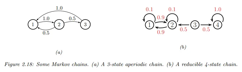 이 예제에서 하나의 고정 분포를 갖는 필요 조건은 상태 전이 다이어그램이 단일 연결된 구성요소여야 한다는 것을 볼 수 있다. 즉 임의의 상태에서 다른 임의의 상태로 이동할 수 있다. 이런 체인은 irreducible(환원 불가능)이라고 한다.