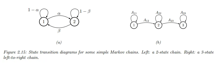 여기서 는 상태 에서 상태 로 가는 확률이고, 행렬의 각 행의 합은 1이다. .