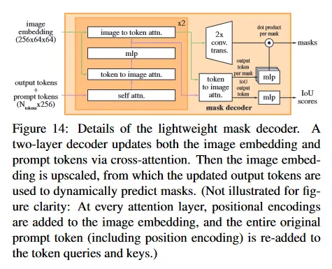 Mask Decoder는 Transformer Decoder를 사용하며 구성되고, Image Encoder의 image embedding과 Prompt Encoder의 Dense, Sparse Embedding을 입력으로 받아 최종적으로 Mask를 출력한다. 여기서 Mask Token과 IoU Token을 사용하여 Mask에 대한 예측과 해당 Mask의 품질(IoU Score)를 출력한다.