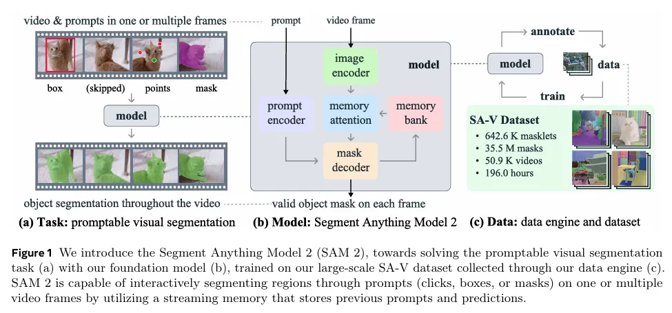 우리는 Segment Anything Model 2(SAM 2)을 소개한다. 이것은 비디오와 이미지 segmentation에 대해 통합된 모델이다(우리는 이미지를 단일 프레임 비디오로 고려한다). 우리의 작업은 task, model, dataset을 포함한다(그림 1)