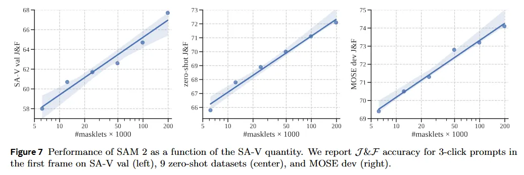 다음으로 우리는 학습 데이터의 규모를 확장하는 것의 효과를 연구한다. SAM 2는 다양한 크기의 SA-V에서 학습하기 전에 SA-1B에서 pre-trained이다. 우리는 3개의 벤치마크(SA-V val, zero-shot, MODE dev)에 대해 평균 점수를 리포트한다(첫 프레임에서 3 클릭으로 prompt된). 그림 7은 모든 벤치마크에서 학습 데이터의 양과 비디오 segmentation 정확도 사이의 일관된 멱법칙을 보인다.