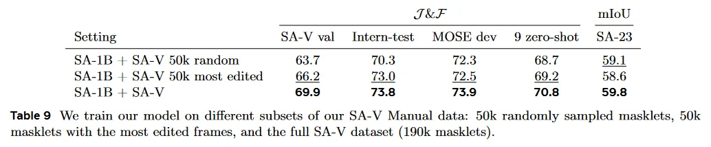 Table 9에서 우리는 품질을 위한 filtering 전략을 실험한다. SA-V에서 50k masklet을 무작위로 샘플링하거나 주석자들에 의해 가장 많이 편집된 masklet을 선택하여 샘플링한다. 수정된 프레임의 수에 기반한 필터링은 데이터의 25%만 사용하여 강력한 성능을 보이며, 무작위 샘플링을 능가한다. 그러나 이것은 190k SA-V masklet을 전체를 사용하는 것보다는 나쁘다.