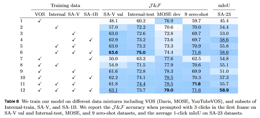 Table 8에서 우리는 다양한 데이터 혼합에서 학습될 때 SAM-2의 정확도를 비교한다. 우리는 SA-1B에서 pre-train하고 각 설정에 대해 별도의 모델을 학습한다. 우리는 iteration의 수(200k)와 batch size(128)을 고정하고 실험 사이의 학습 데이터만 변경한다. SA-V val set, MOSE, 9개 zero-shot video 벤치마크와 SA-23 task에 대한 정확도를 리포트한다. 1행은 순수하게 VOS 데이터셋(Davis, MOSE, YouTubeVOS)에서 학습된 모델이 도메인 내 MOSE dev 에서 잘 수행되지만, 9개의 zero-shot VOS 데이터셋(59.7 )을 포함하여 다른 모든 것에서는 빈곤하게 수행되는 것을 보인다.