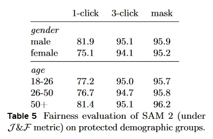 Table 5는 성별과 연령에 따른 사람 segmenting 을 위한 SAM 2의 정확도 비교를 보인다. 3클릭과 ground-truth mask prompt에서 차이가 미미하다. 우리는 1 클릭 prediction을 수동으로 관찰한 결과 모델이 빈번하게 사람 전체 대신 일부분에 대한 mask를 예측하는 것을 발견했다. 사람이 올바르게 segmented인 클립으로 비교를 제한할 때, 1 클릭에서의 격차가 상당히 줄어든다( male은 94.3, female은 92.7). 이것은 불일치가 부분적으로 프롬프트의 모호성에 기인할 수 있음을 시사한다. 부록 G에서 우리는 SA-V에 대한 모델, 데이터, 주석 카드를 제공한다.