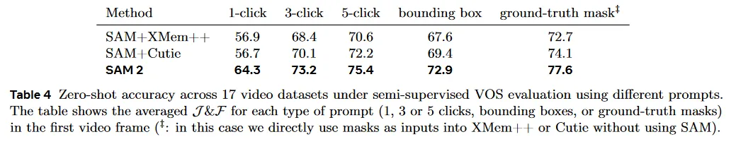 우리는 다음으로 비디오의 첫 프레임에서만 click, box 또는 mask 프롬프트를 사용하는 semi-supervised video object segmentation(VOS) 설정을 평가한다. 클릭 프롬프트를 사용할 때, 우리는 비디오의 첫 프레임에서 1, 3, 5 click을 interactively샘플링한 다음 이러한 클릭에 기반하여 object를 추적한다.
