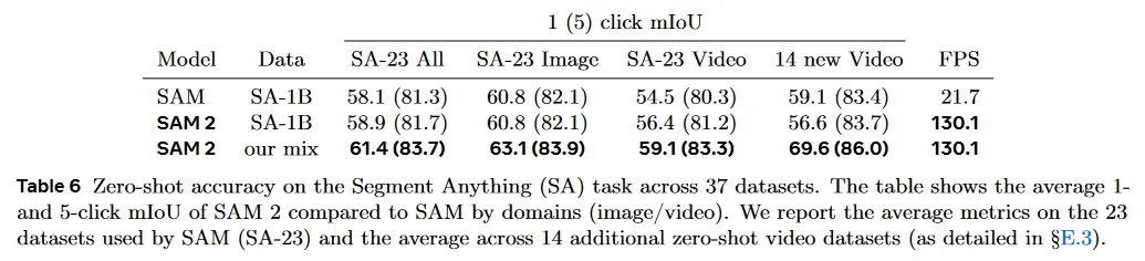 첫 열(SA-23 All)은 SAM의 23개 데이터셋에 대한 정확도를 보인다. SAM 2는 임의의 추가 데이터 사용 없이 SAM(1 클릭으로 58.1 mIoU) 보다 더 높은 정확도(1 클릭으로 58.9 mIoU)를 달성하면서 6배 더 빠르다. 이것은 주로 SAM 2의 더 작지만 효과적인 Hiera image encoder 덕분이다.