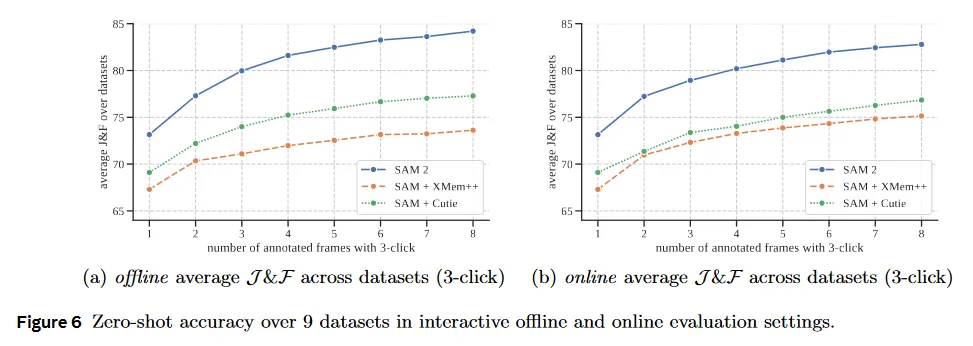 그림 6에서 우리는 상호작용 프레임에 대한 평균 정확도를 리포트한다. SAM 2는 offline과 online 평가 설정 모두에서 SAM+XMem++와 SAM+Cutie를 능가한다. 9개의 모든 데이터셋에서(데이터셋 별 결과는 E.1에서 확인) SAM 2는 두 방법을 압도하며, SAM 2가 소수의 클릭만으로 고품질 비디오 segmentation을 생성할 수 있고, 추가 프롬프트로 결과를 계속 개선할 수 있음을 확인한다. 전체적으로 SAM 2는 3배 더 적은 iteration으로 더 나은 segmentation 정확도를 생성할 수 있다.