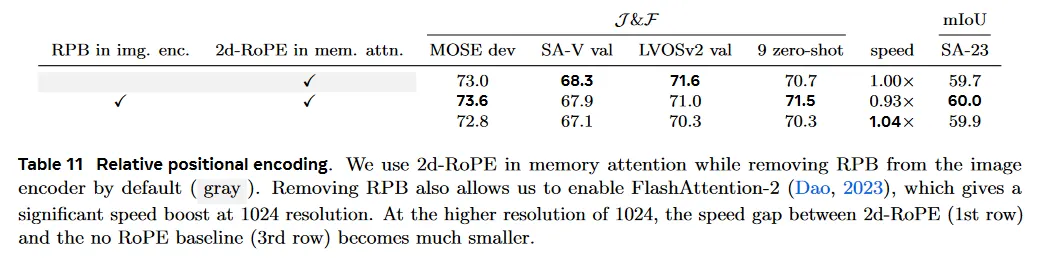 SAM이 Li et al(2022b)를 따라 relative positional bias(RPB)를 모든 image encoder 레이어에 추가했지만, Bolya et al(2023)은 global attention layer를 제외한 모든 곳에서 RPB를 제거하고 ‘absolute-win’ positional encoding을 채택하여 큰 속도 향상을 이끌었다. 우리는 이것에 추가로 이미지 encoder에서 모든 RPB를 제거했다. SA-23에서 성능 저하 없이 비디오 벤치마크에서 최소 저하만 발생했으며(Table 11), 1024 해상도에서 상당한 속도 향상을 얻는다. 우리는 또한 memory attention에서 2d-RoPE를 사용하는 것이 유익함을 발견한다.