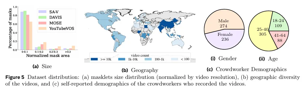 주석은 190.9K 수작업 masklet 주석과 우리의 데이터 엔진으로 수집된 451.7K automatic masklet으로 구성된다. masklet이 overlaid인(수동과 자동) 예제 비디오는 그림 4에 보여진다. SA-V는 가장 큰 VOS 데이터셋에 비해 53배 (자동 주석 없이 15배) 더 많은 mask를 갖는다. SA-V 수동의 소실률(최소 한 프레임에서 사라졌다가 다시 등장하는 주석처리된 masklet의 비율)은 42.5%로, 기존 데이터셋과 비교하여 경쟁력 있다. 그림 5a는 DAVIS, MOSE, YouTubeVOS와 mask 크기 분포(비디오 해상도에 의해 정규화된)를 비교한 것이다. SA-V mask의 88% 이상이 0.1 미만의 정규화된 마스크 영역을 가지고 있다.