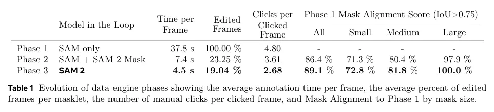 표 1은 통제된 실험을 통해 각 데이터 엔진의 주석 프로토콜 비교를 보인다(상세는 D.2.2 참조). 우리는 프레임 당 평균 주석처리 시간, masklet 당 수동 편집된 프레임의 평균 비율과 클릭된 프레임 당 평균 클릭 수를 비교한다. 품질 평가를 위해, 우리는 Phase 1 Mask Alignment Score를 1 단계의 해당 mask와 비교하여 IoU가 0.75를 초과하는 마스크의 비율로 정의한다. Phase 1 데이터는 프레임별로 고품질 수동 주석이 있어 레퍼런스로 선택된다. loop에 Sam 2를 포함한 Phase 3은 효율성 증가와 유사한 품질을 이끈다. 이것은 Phase 1에 비해 8.4배 빠르고, 편집된 프레임 비율과 프레임 당 클릭 수가 가장 낮으며, 더 나은 alignment를 갖는다.