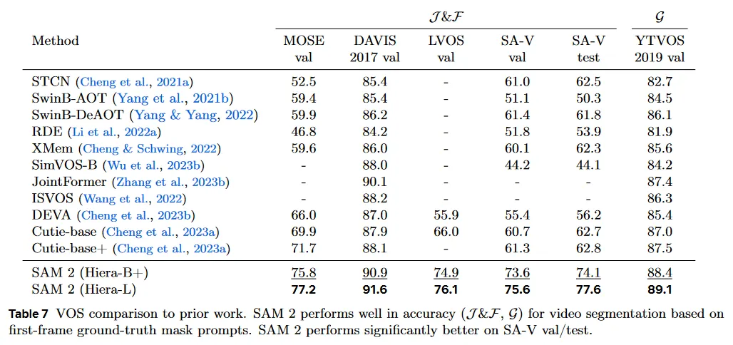 우리는 Table 7에서 기존 최첨단과 비교를 제시하고 표준 프로토콜을 사용한 정확도를 리포트한다. SAM 2는 기존의 최고 방법보다 상당한 개선을 보인다. 더 큰 이미지 encoder를 사용하면 전반적으로 상당한 정확도 향상을 얻을 수 있음을 관찰한다.