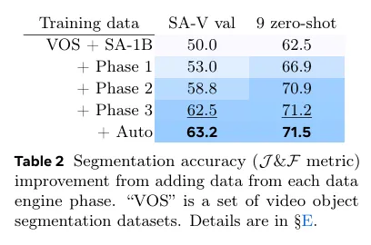 표 2는 반복수를 고정하고, 각 단계의 끝에 사용 가능한 데이터 학습된 SAM 2의 성능 비교를 보인다. 그러므로 추가 데이터의 영향만 측정한다. 우리는 자체 SA-V validation set과 9개의 zero-shot 벤치마크에서 첫 프레임에 3 클릭으로 프롬프팅할 때, 표준 J&F 정확도 메트릭(높을수록 더 좋은)를 사용하여 평가한다. 우리는 각 단계에서 데이터를 반복적으로 포함한 후에 일관된 개선을 확인했다. 이는 도메인 내 SV-V 검증 셋 뿐만 아니라 9개 zero-shot 벤치마크에서도 마찬가지이다.