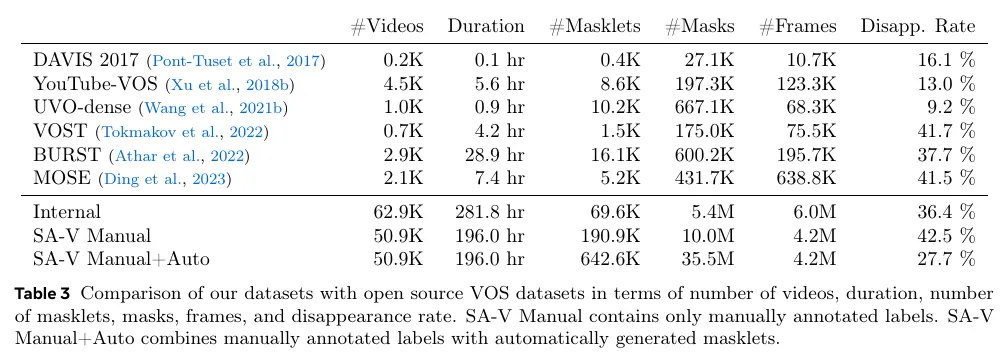 SA-V 데이터셋은 우리의 데이터 엔진을 사용하여 수집되었고 50.9K 비디오와 642.6K masklet으로 구성된다. 표 3에서 비디오, masklet, mask의 수를 기준으로 SA-V의 구성과 일반적인 VOS 데이터셋을 비교한다. 특히 주석처리된 마스크의 수는 기존의 어떤 VOS 데이터셋보다 53배(auto 없이 15배) 더 크다. 미래 작업에 대한 후속 자원을 제공하기 위해 우리는 permissive 라이센스 하에 SA-V를 배포한다.
