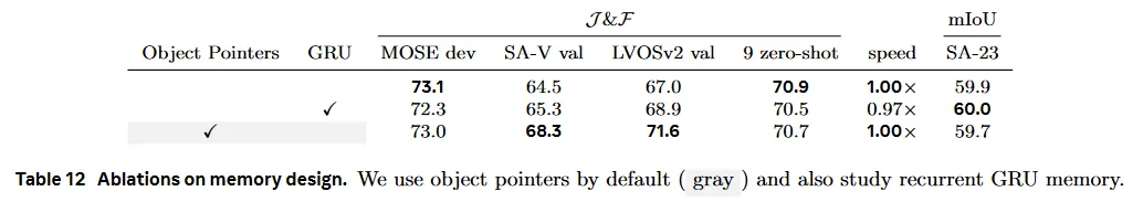 우리는 다른 프레임의 mask decoder 출력에서 object pointer vector에 cross-attending 하는 것의 영향을 ablate한다(섹션 4). Table 12의 결과는 object pointer에 cross-attending 하는 것이 9개 zero-shot 데이터셋에 걸쳐 평균 성능을 개선하지 않지만, SA-V val 데이터셋과 도전적인 LVOSv2 벤치마크(validation split)에서 성능을 크게 향상시킨다는 것을 보인다. 따라서 우리는 memory bank와 함께 object pointer에 대해 cross-attending하는 것을 default로 한다.