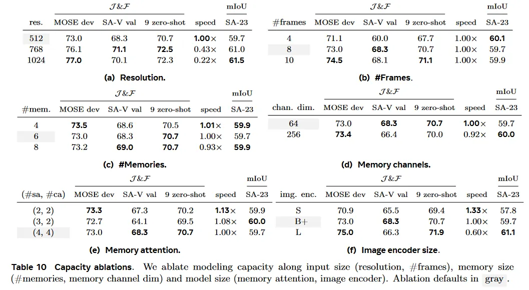 이미지 encoder 또는 memory-attention(#self-/#cross-attention block)에서 더 많은 수용량을 추가하면 일반적으로 결과를 개선한다. Table 10e, 10f 참조. 이미지 encoder를 확장하면 이미지와 비디오 메트릭 모두에서 이익을 가져오는 반면 memory-attention을 확장하는 것은 비디오 메트릭만 개선한다. 우리는 속도와 정확도 사이의 균형을 맞추기 위해 B+이미지 encoder를 default로 사용한다.