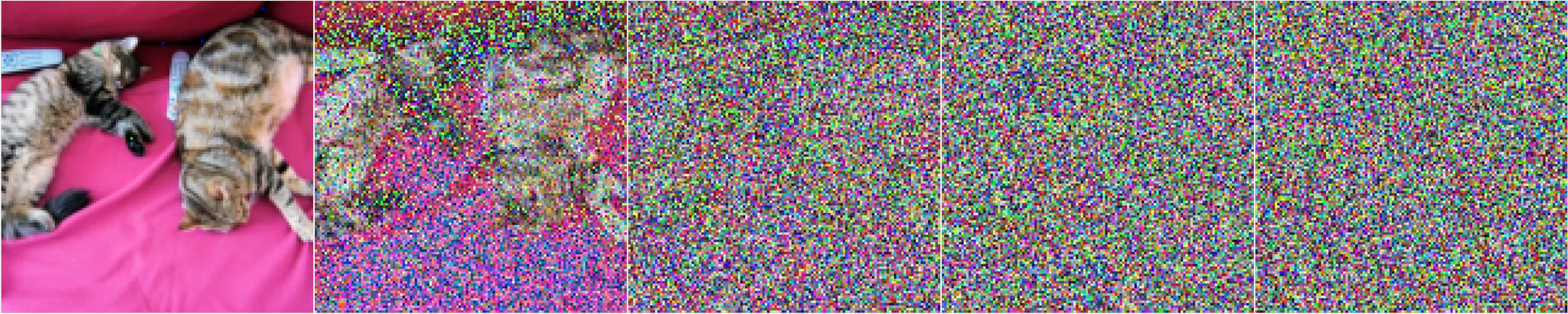 고정된 (또는 predefined) forward diffusion process 를 선택하여, 이미지가 순수 노이즈가 될 때까지 점진적으로 가우시안 노이즈를 추가한다.