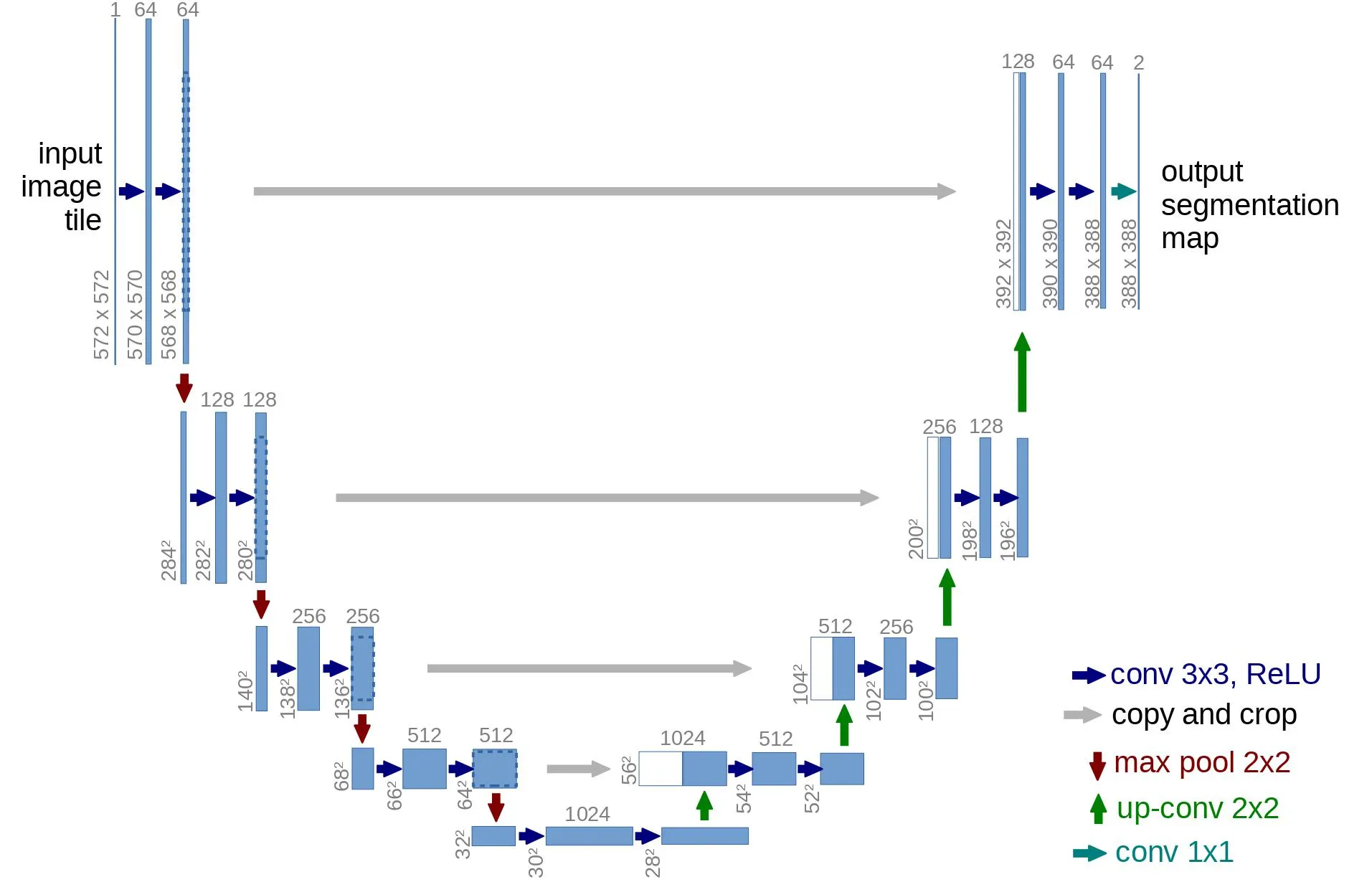 보시다시피 U-Net 모델은 우선 입력을 downsampling 하고(즉 공간 해상도 측면에서 입력을 더 작게 만든다) 그 후에 upsampling을 수행한다.