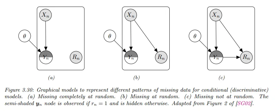 아래 그림 graphical 모델 표기를 사용하여 판별 설정에 대해 3개 누락 데이터 시나리오를 보여준다.