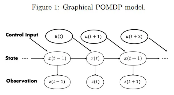 우선 확률론적 관점에서 이산 시간 동적 시스템을 살핀다. 그림 1은 graphical model 형식에서 Partially Observable Markov Decision Process(POMDP)을 시각화 한다.