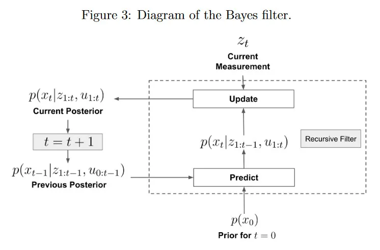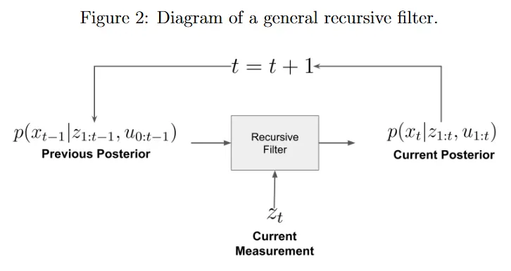 recursive filter는 상태 posterior를 추정하기 위해 지속적으로 새로운 측정을 ingests(섭취하다). 그림 2 참조. 각 time step 에서 우리는 이전 posterior 와 새로운 control input 과 새로운 측정값 만 사용하여 새로운 posterior 를 계산한다. 따라서 recursive filter의 복잡도는 시간 관점에서 상수이다. 이것은 이력의 크기에 의존하지 않고 실시간 추론에 적합하다.