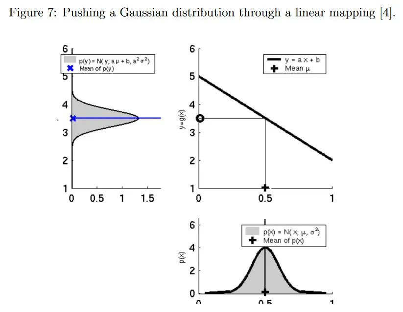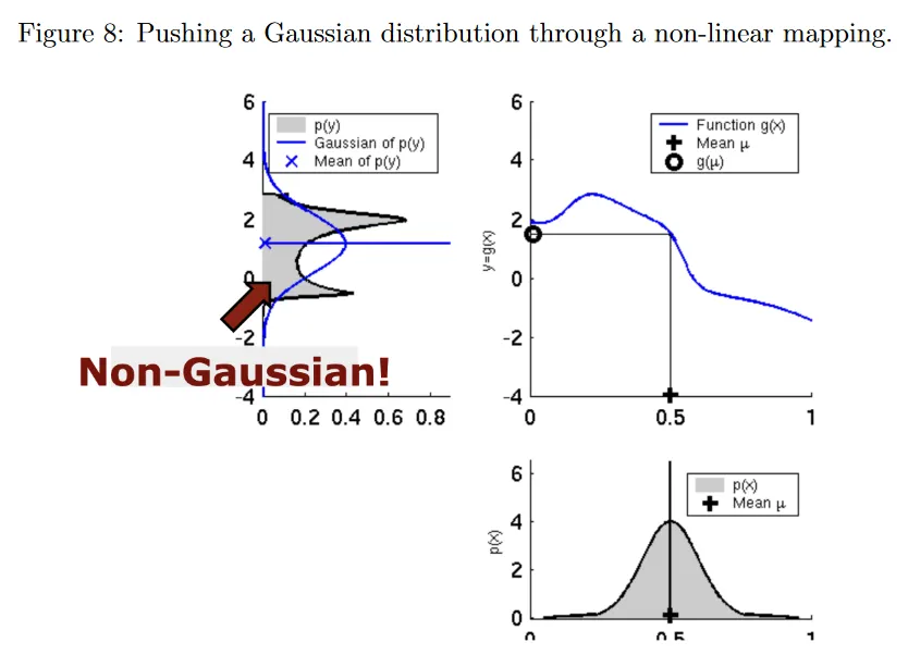 그림 7은 확률 변수 에 대한 선형 매핑을 적용해도 변환 후 결과가 여전히 가우시안 분포임을 보인다. 반면 그림 8은 비선형 매핑을 적용하면 비가우시안 분포가 되어 이전 예측과 업데이트 방정식을 더는 적용할 수 없음을 보인다.