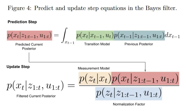 update step에서 새로운 측정값 를 통합하여 예측된 믿음을 다듬는다. measurement likelihood 는 예측된 가 주어질 때 관측 가 얼마나 가능성 있는지를 나타낸다. 따라서 update step에서 분자는 다음 2가지에 기반하여 확률을 특정한 에 할당한다. 1) 가 측정값 을 얼마나 잘 설명하는지 2) 동적 시스템 이전 posterior 추정치 에서 로 전이할 가능성. 분모는 단순히 업데이트된 posterior 분포가 합해서 1이 되도록 보장하는 정규화 상수이다. 믿음을 예측하고 업데이트한 후에 새로운 측정값 이 존재하는 한 에서 이 프로세스를 반복할 수 있다.
