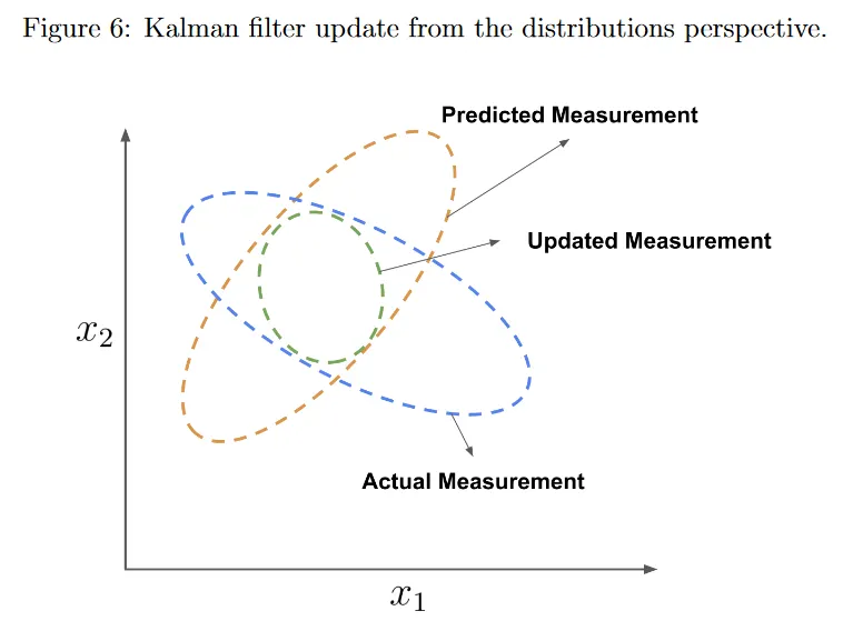 그림 6에서 축은 상태의 컴포넌트이다. 우리는 top-down으로 분포를 본다. 오렌지색 타원은 으로 주어지는 예측된 측정에 대한 분포를 나타낸다. 파란색 타원은 로 주어지는 실제 측정에 대한 분포를 나타낸다. Kalman filter는 이 분포 모두를 곱하여 두 분포 모두에서 가 가장 가능성 있는 겹치는 region을 찾는다(을 떠올려라). 이것은 업데이트된 분포가 되며, 녹색 타원으로 표시되는 로 주어지는 또 다른 가우시안이다. 겹치는 부분을 취하기 때문에 업데이트된 분포가 두 부모 분포와 비교하여 더 작다는 것에 유의하라. 예측 단계에서는 공분산(불확실성)이 증가하지만, 업데이트 단계에서는 새로운 측정 를 사용하여 공분산을 감소시킨다. 따라서 공분산은 예측과 업데이트 단계 후에 증가와 감소를 반복한다. 전체적으로 공분산은 수렴할 때까지 감소한다.
