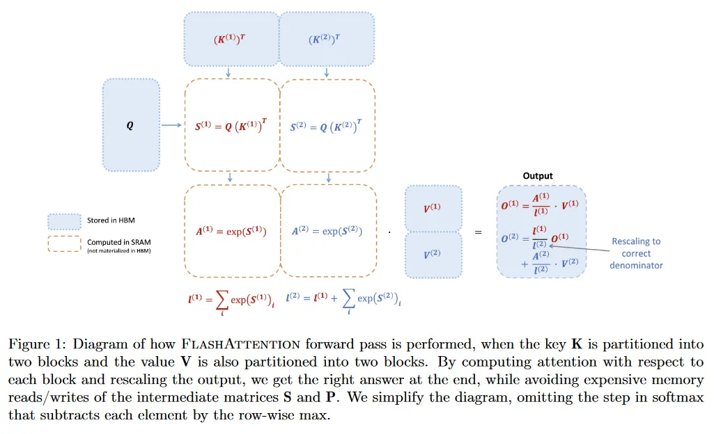 FlashAttention은 tiling의 전통적인 기법을 적용하여 메모리 IO를 줄인다. (1) 입력의 블록을 HBM에서 SRAM으로 로딩하고, (2) 그 블록에 대해 attention을 계산하고, (3) 큰 중간 행렬 와 를 HBM에 쓰지 않고 출력을 업데이트한다. softmax가 전체 행 또는 행의 블록을 커플링하므로, online softmax는 attention 계산을 블록으로 분할할 수 있고 각 블록의 출력을 rescale하여 최종적으로 (근사 없이) 올바른 결과를 얻을 수 있다. 메모리 읽기/쓰기의 양을 크게 감소시켜서 FlashAttention은 최적화된 baseline attention 구현에 대해 2-4배 빠른 실제 속도를 얻는다.