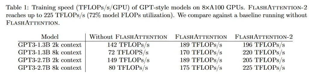 End-to-end training speed. 시퀀스 길이 2k나 2k에서 1.3B와 2.7B 크기의 GPT style 모델을 학습하기 위해 end-to-end를 사용할 때, FlashAttention-2는 FlashAttention과 비교하여 1.3배 빠르고, FlashAttention 없는 baseline과 비교하여 2.8배 더 빠르다. FlashAttention-2는 A100 GPU당 225 TFLOPs/s (72% 모델 FLOPs 활용률)를 달성한다.