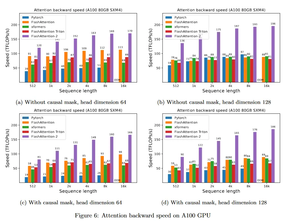 A100 80GB SXM4 GPU에서 다양한 설정에 대해(causal mask 있음/없음, head 차원 64 또는 128) 다양한 attention 방법의 실행을 측정한다. 우리는 결과를 그림 4, 그림 5, 그림 6에 리포트한다. FlashAttention-2가 FlashAttention과 xformers(’cutlass’ 구현) 보다 약 2배 빠르다는 것을 볼 수 있다. FlashAttention-2는 Triton의 FlashAttention 보다도 forward pass에서 약 1.3-1.5배 빠르고, backward pass에서 2배 더 빠르다. Pytorch의 표준 attention 구현과 비교하여 FlashAttention-2는 10배 더 빠르다.